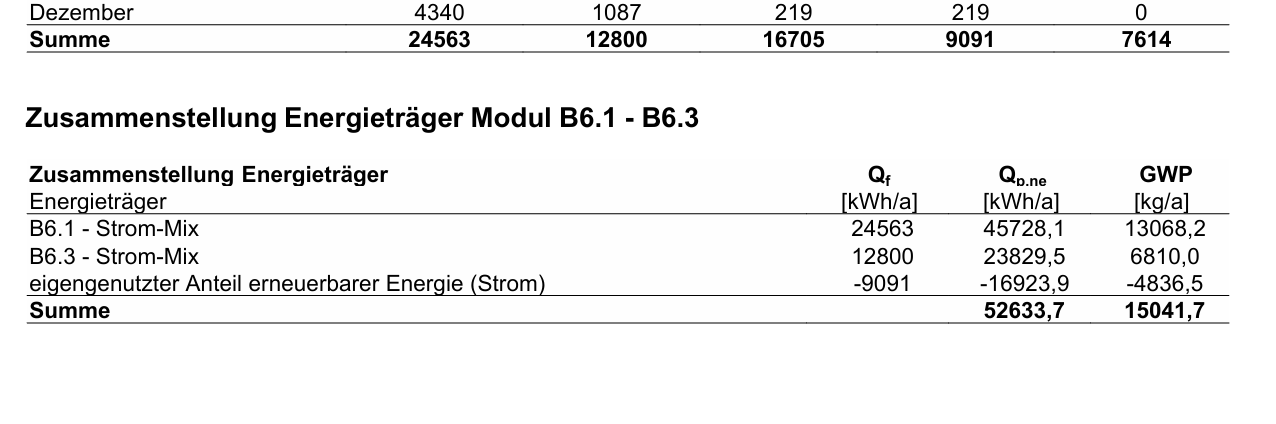 „WARNUNG: LCA: Es wurde kein PV-Ertrag im Gebäude angesetzt, es gibt aber eine Fotovoltaik-Anlage bei den Prozessen.“