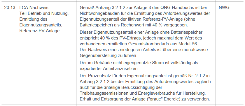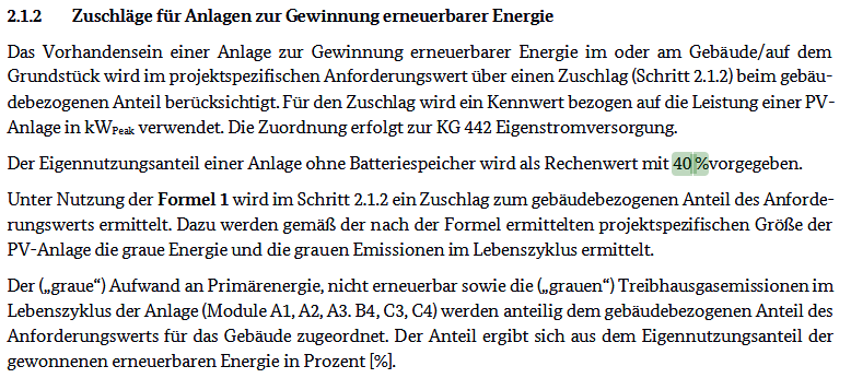 ... wird der Rechenwert mit 40% vorgegeben, allerdings soll der "graue" Aufwand an Primärenergie und Treibhausgasemissionen (was ja dem gebäudebezogenen Anforderungswert entspricht?) mit dem projektspezifischen und durch den Stromverbrauch des Referenzgebäudes gedeckelten Eigennutzungsanteil in Prozent bestimmt werden.
