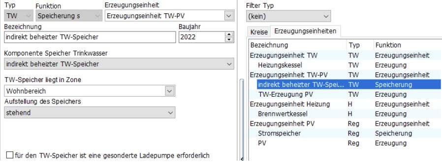 Bei der Eingabe der TW-Speicherung steht eine bivalenter, ein elektrisch betriebener und ein direkt gasbetriebener Speicher zur Auswahl.