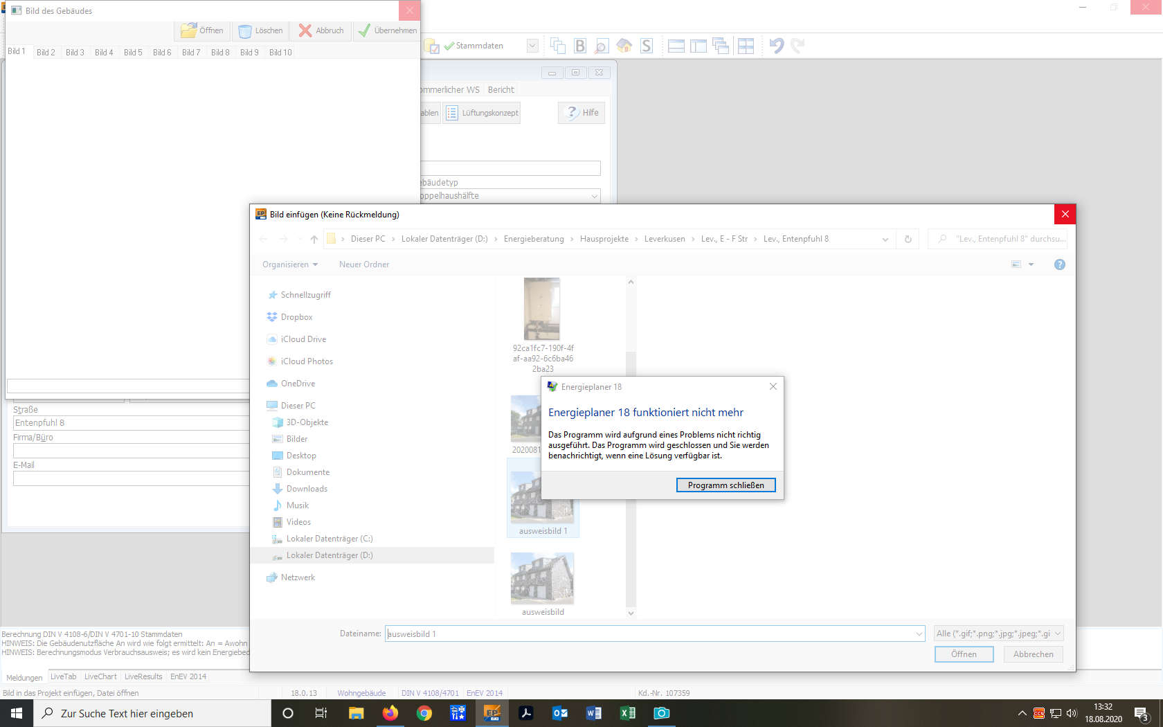 Ich habe ein fertiges Projekt mit BKI 18 als Verbrauchsausweis. Beim Einfügen des Ausweisbildes kommt die Meldung BKI 18 funktioniert nicht mehr. Die meldung sagt das progarmm wird geschlossen. Wenn eine Lösung verfügbar ist erfolgt nachricht.
