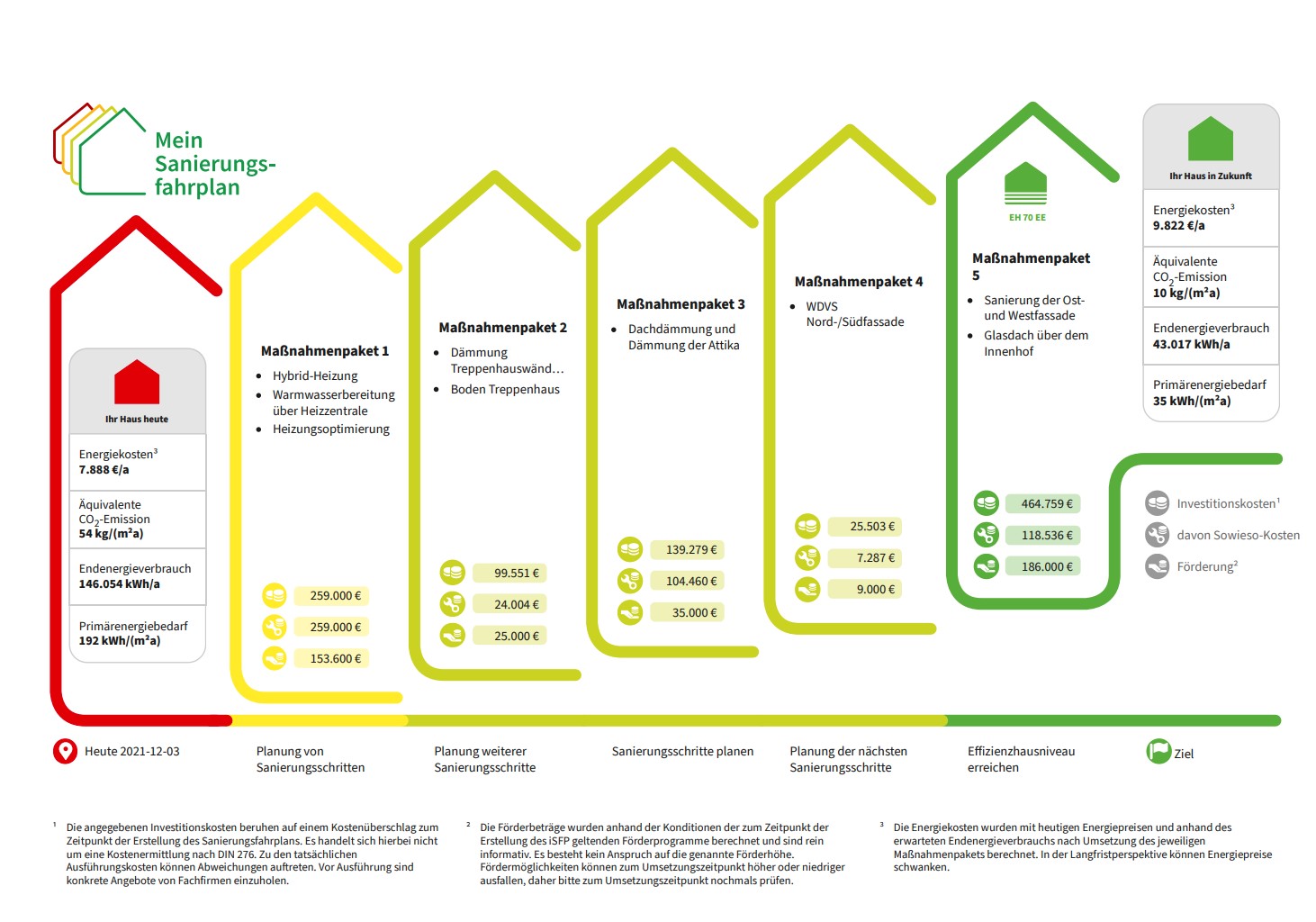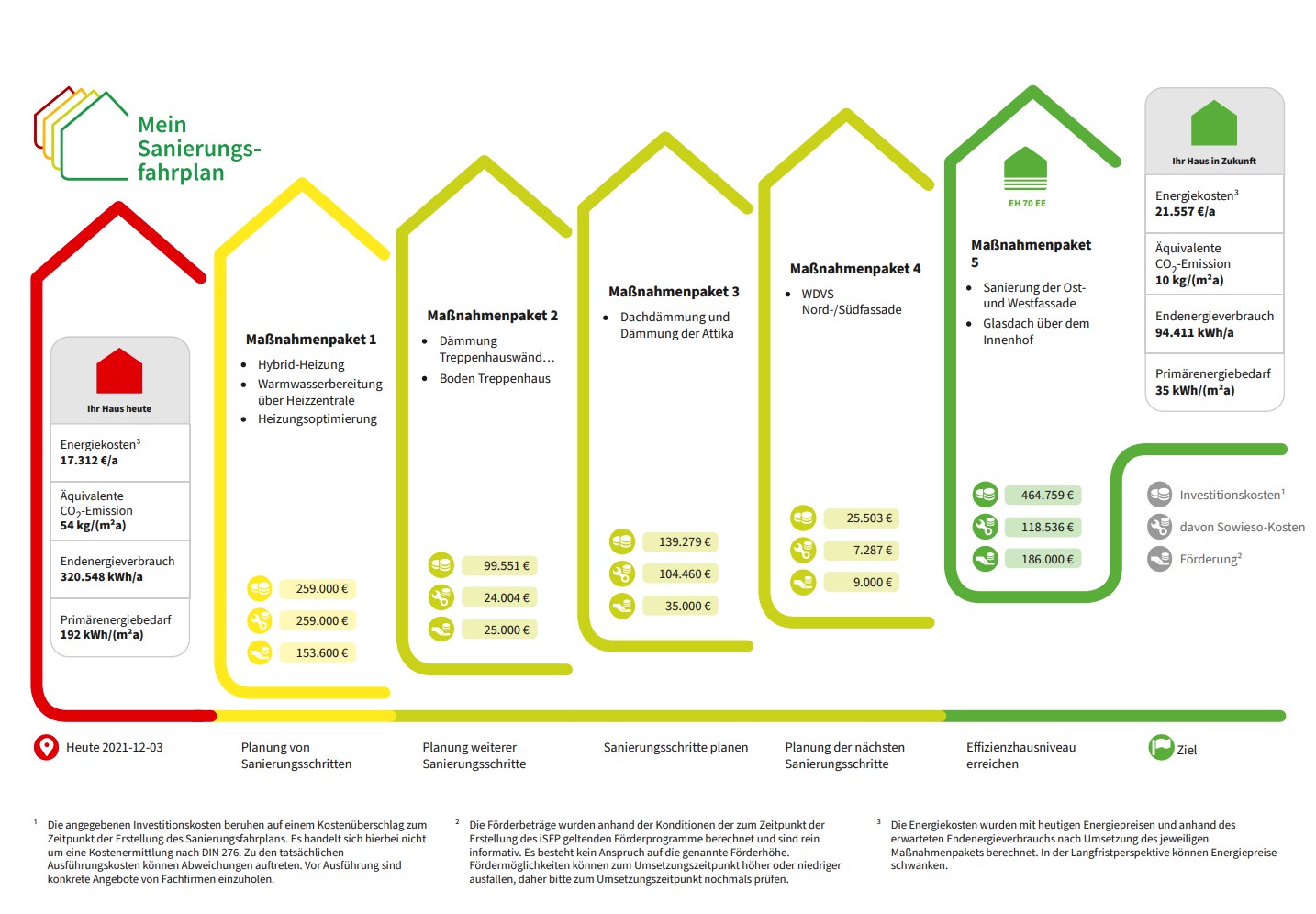 auf Basis Wärmemengenzähler ergeben sich unsaniert 7.888 €/m² saniert 9.822 €/m². Endenergie unsaniert 146.054 kWh/a saniert 43.017 kWh/a Primärenergie unsaniert 192 kWh/(m²a) saniert 35 kWh/(m²a)