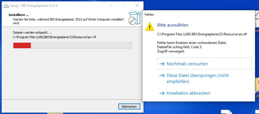 Ich habe gerade versucht das aktuelle Update des BKI-EP zu installieren. Da ich da aber eine Fehlermeldung bekommen habe, habe ich das Update abgebrochen. Nun bekomme ich aber bei öffnen der vorhandenen Installation des BKI EP die angehängte Fehlermeldung.