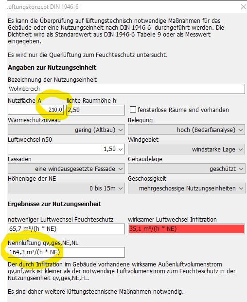 z.B. müsste bei eine Fläche der Nutzungseinheit von 210qm der Wert für die Nennlüftung 215 sein, aber das Programm liefert einen Wert von 164,3. siehe Screenshot